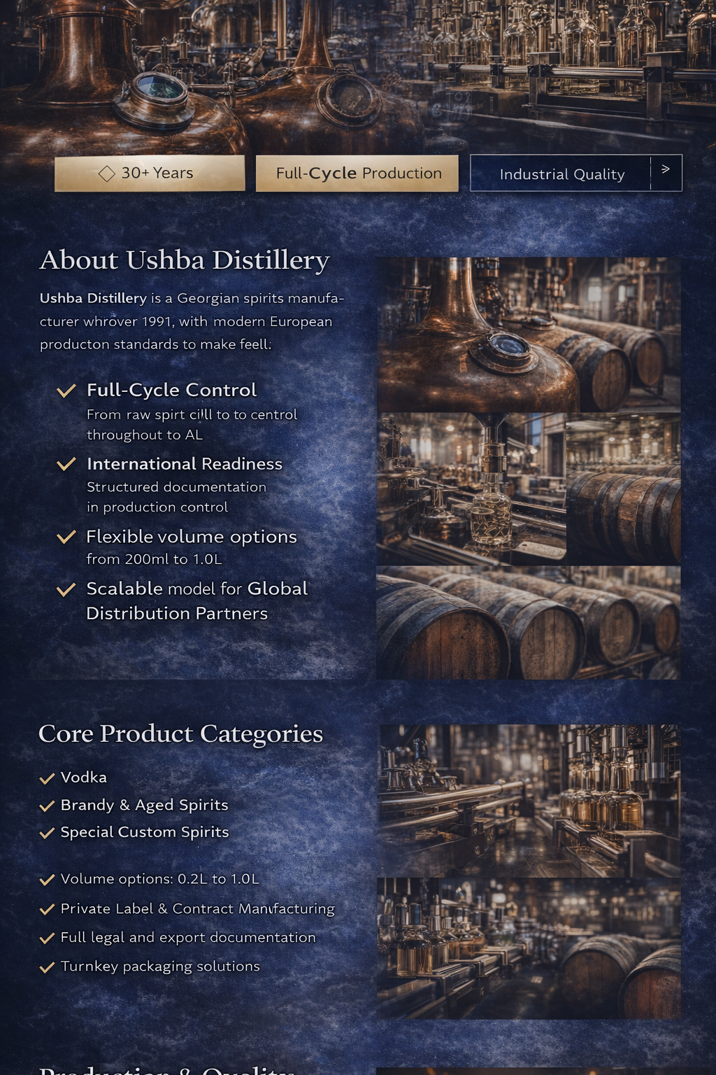 Ushba Distillery is an industrial spirits manufacturer with 30+ years of experience and a full-cycle facility built for export, private label manufacturing, and premium brand development. Ushba Distillery არის ინდუსტრიული მწარმოებელი 30+ წლიანი გამოცდილებით და სრული ციკლის საწარმოთი, რომელიც შექმნილია ექსპორტისთვის, Private Label წარმოებისთვის და პრემიუმ ბრენდების განვითარებისთვის. Ushba Distillery — промышленный производитель крепкого алкоголя с опытом 30+ лет и полным производственным циклом, готовый к экспорту, private label и развитию премиальных брендов.
